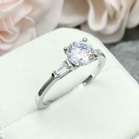 2ct Engagement Ring Round Cut Diamond Baguette Accent Trilogy 14k WhiteGold Over