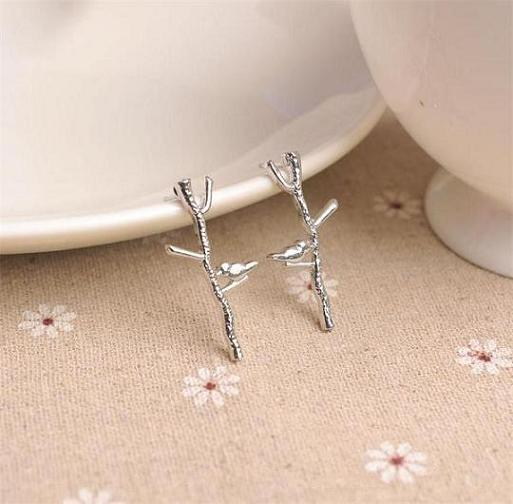 Cute Lovely Bird on Twig Tree Branch Women Stud Earrings 14k White Gold Finish