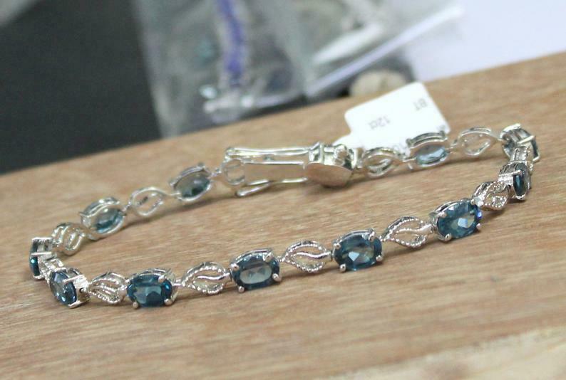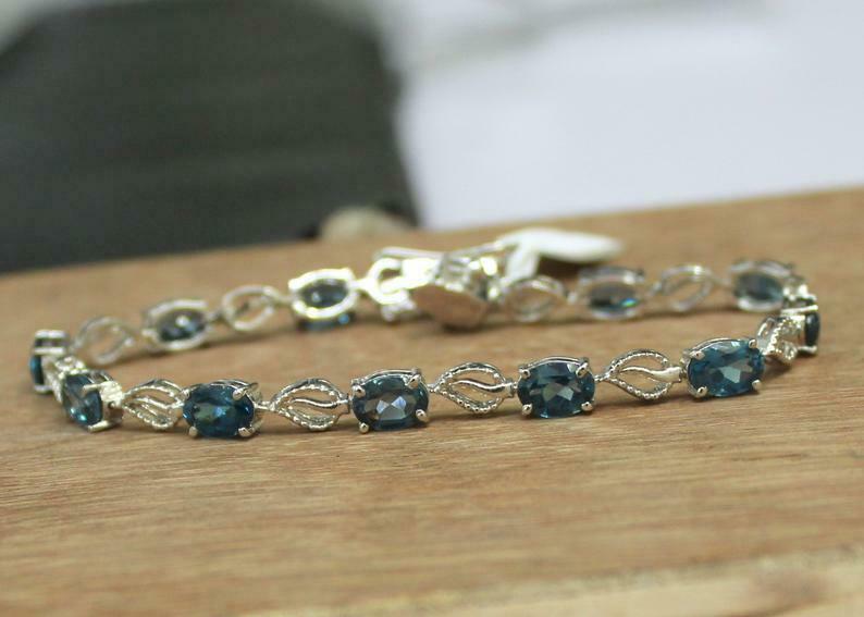 5ct Oval Cut London Blue Topaz Leaf Design Bracelet 14K White Gold Finish