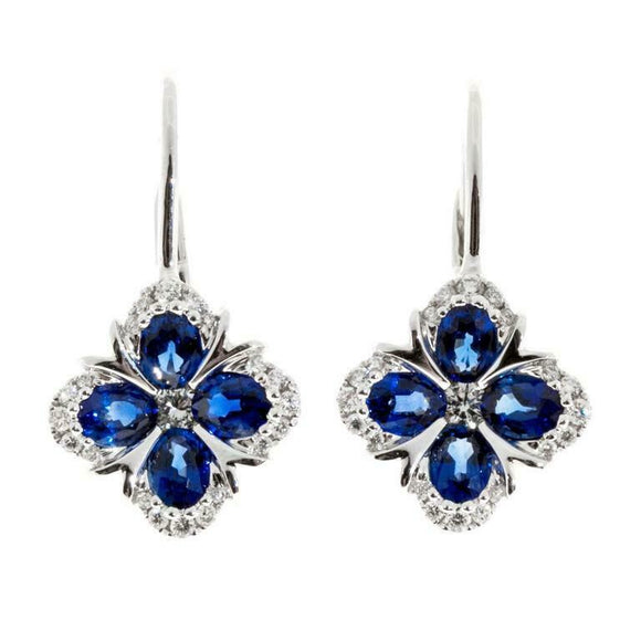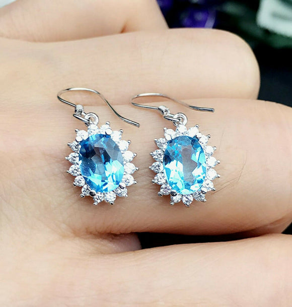 2ct Oval Cut Blue Sapphire Halo Flower Drop Earrings Women 14k White Gold Finish