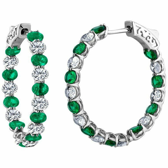 3ct Oval Cut Green Emerald Diamond Inside Out Hoop Earrings 14k WhiteGold Finish