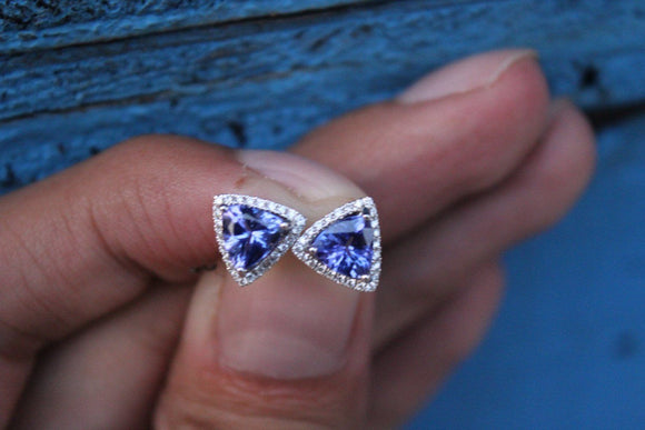 2ct Trillion Cut Blue Tanzanite Diamond Halo Stud Earrings 14k White Gold Finish