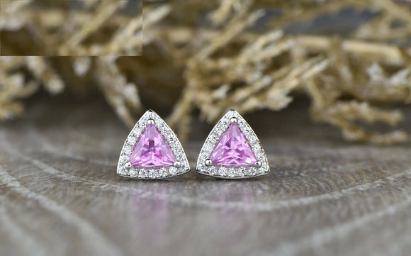 1ct Trillion Cut Pink Sapphire Halo Screw Back Stud Earrings 14k White Gold Over