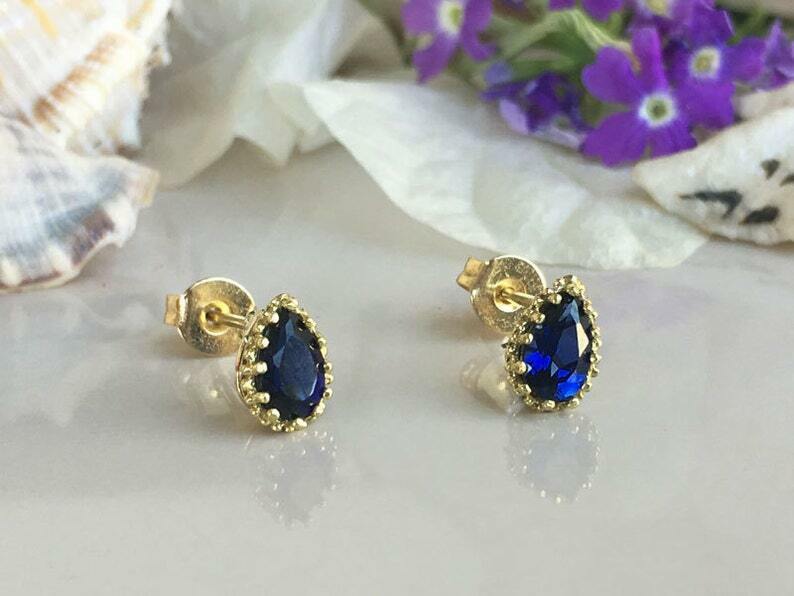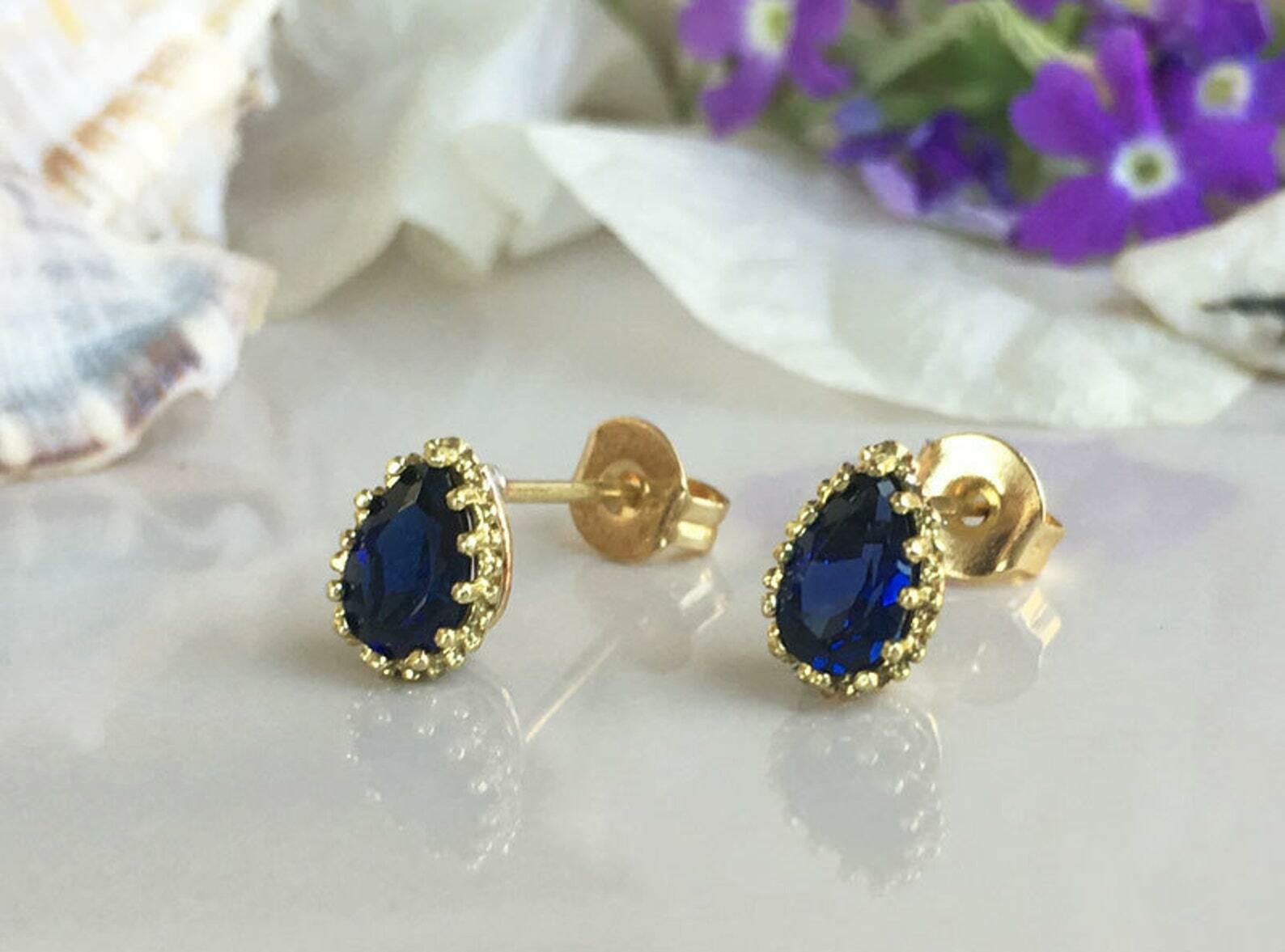 1.3ct Stud Earrings Pear Cut Blue Sapphire Crown Solitaire 14k Yellow Gold Finish