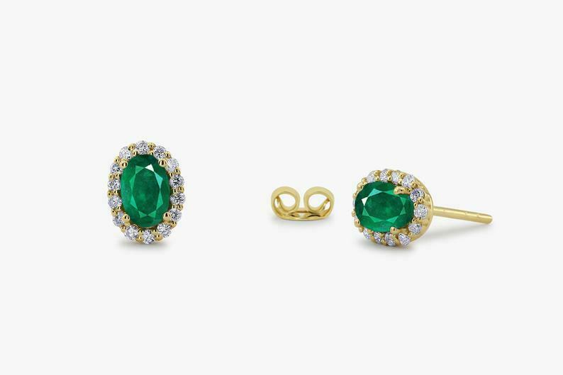 1.4ct Oval Cut Green Emerald Diamond Halo Stud Earrings 14k Yellow Gold Finish