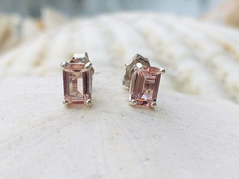 1.4ct Stud Earrings Emerald Cut Peach Morganite Solitaire 14k White Gold Finish