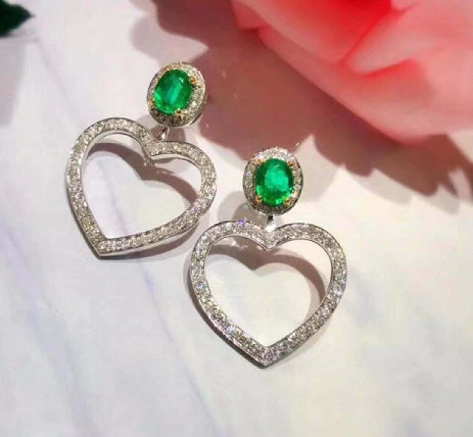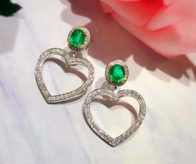 1.5ct Drop Earrings Round Cut Green Emerald Stylish Heart 14k White Gold Finish