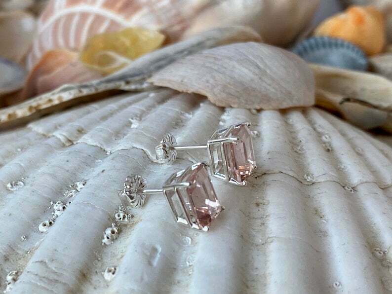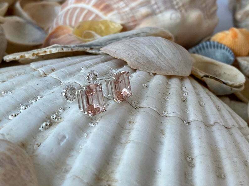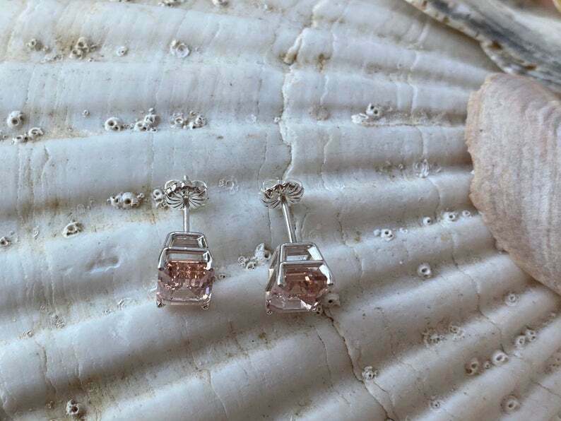 1.5ct Stud Earrings Emerald Cut Peach Morganite Solitaire 14k White Gold Finish