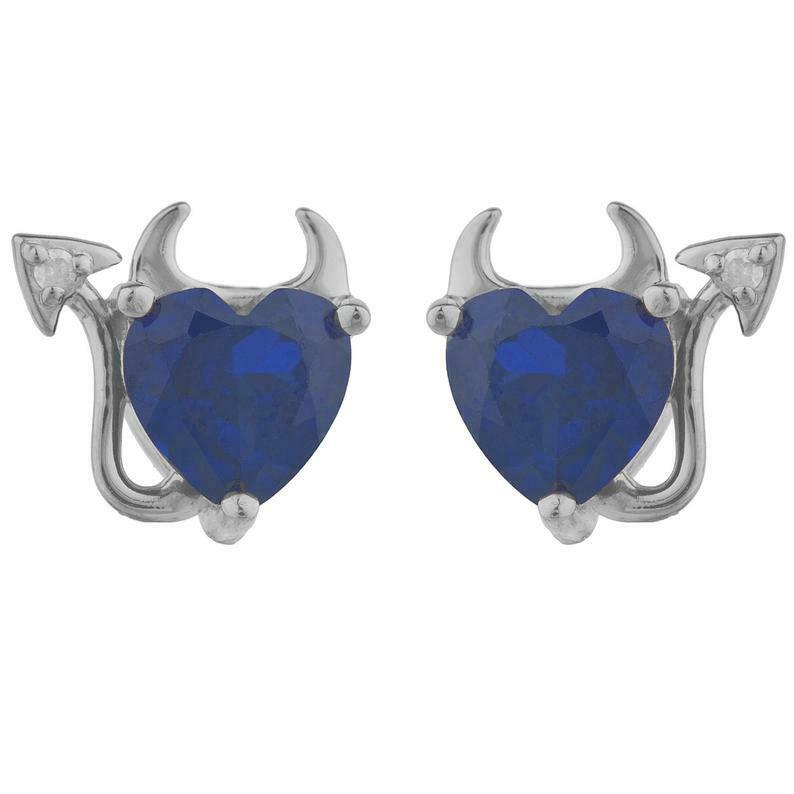 1.5ct Stud Earrings Heart Cut Blue Sapphire Devil Design 14k White Gold Finish