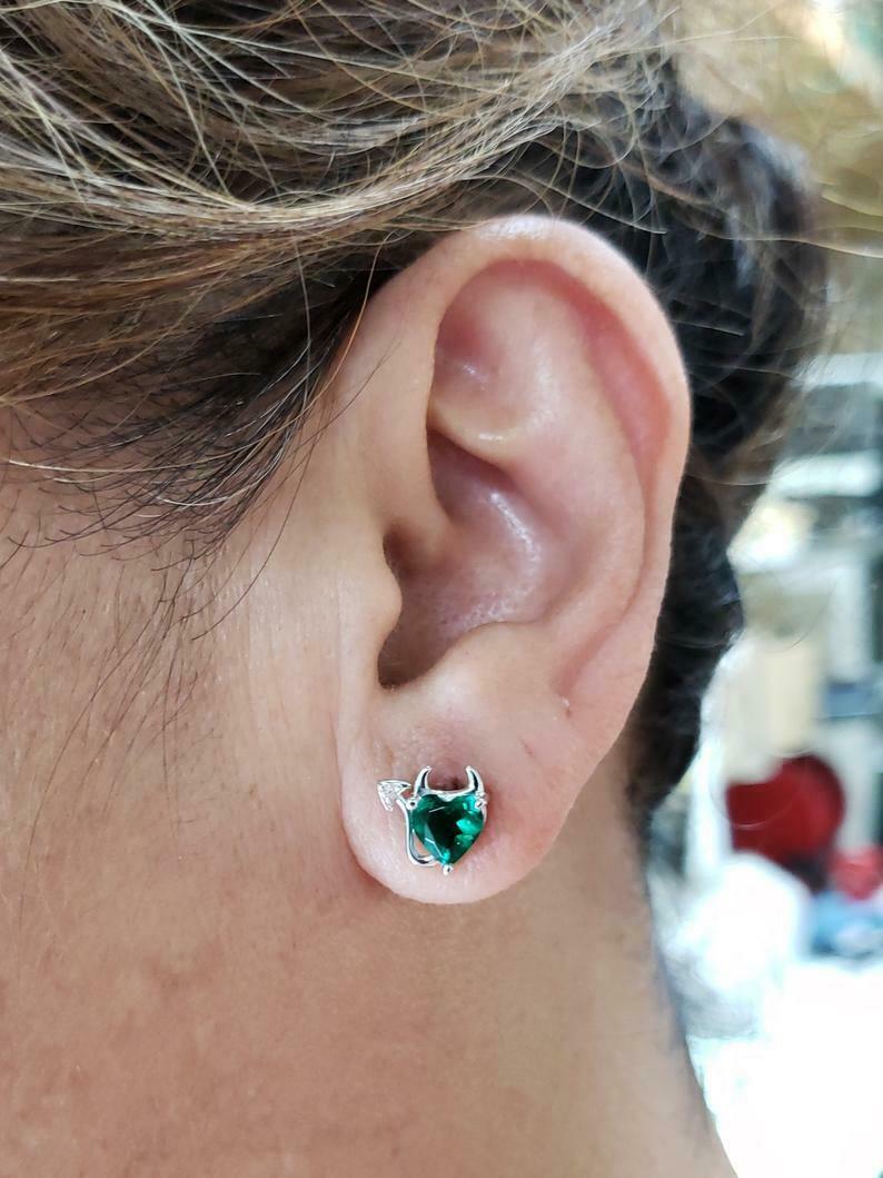 1.5ct Stud Earrings Heart Cut Green Emerald Devil Design 14k White Gold Finish