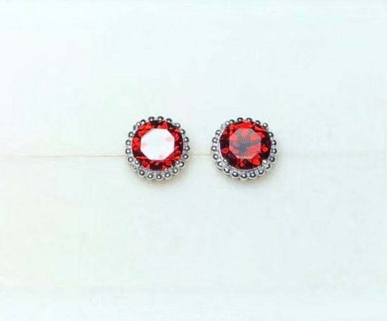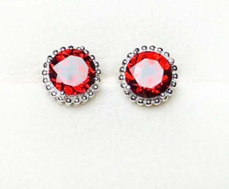 1.5ct Stud Earrings Round Cut Red Garnet Halo Beaded 14k White Gold Finish