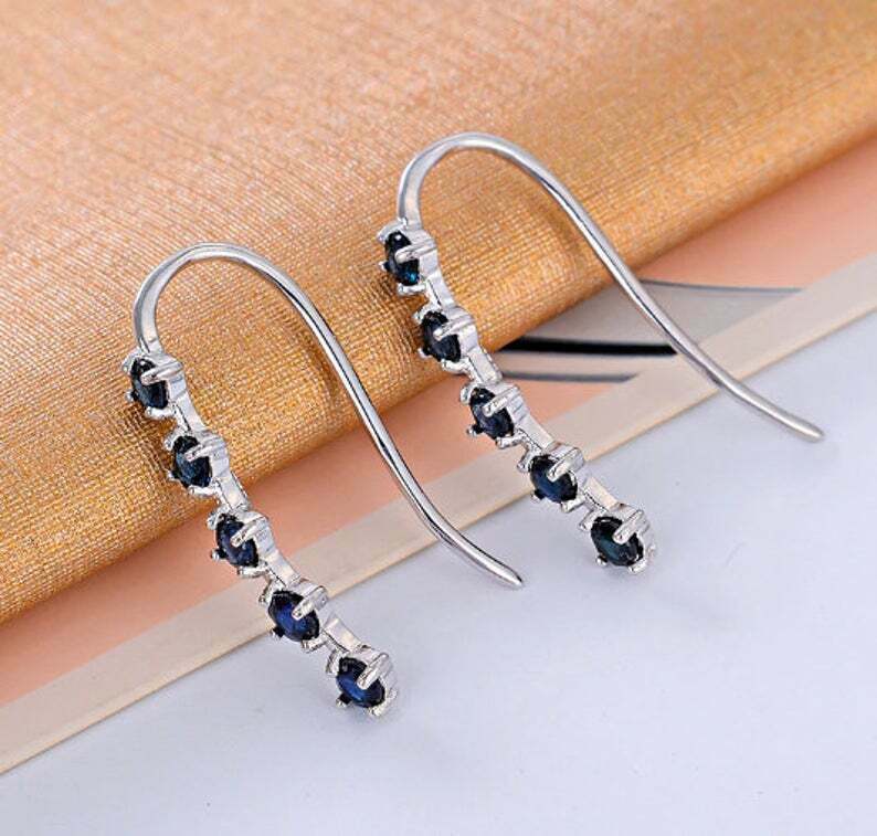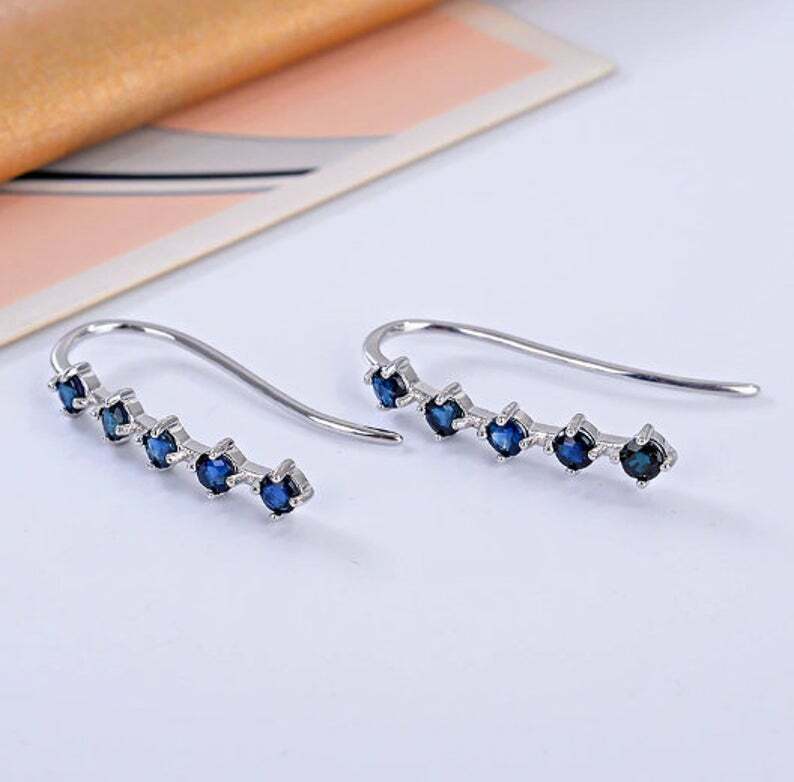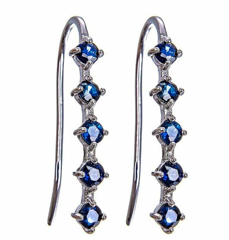 1.6ct Dangle Earrings Round Cut Blue Sapphire Vertical Bar 14k White Gold Finish