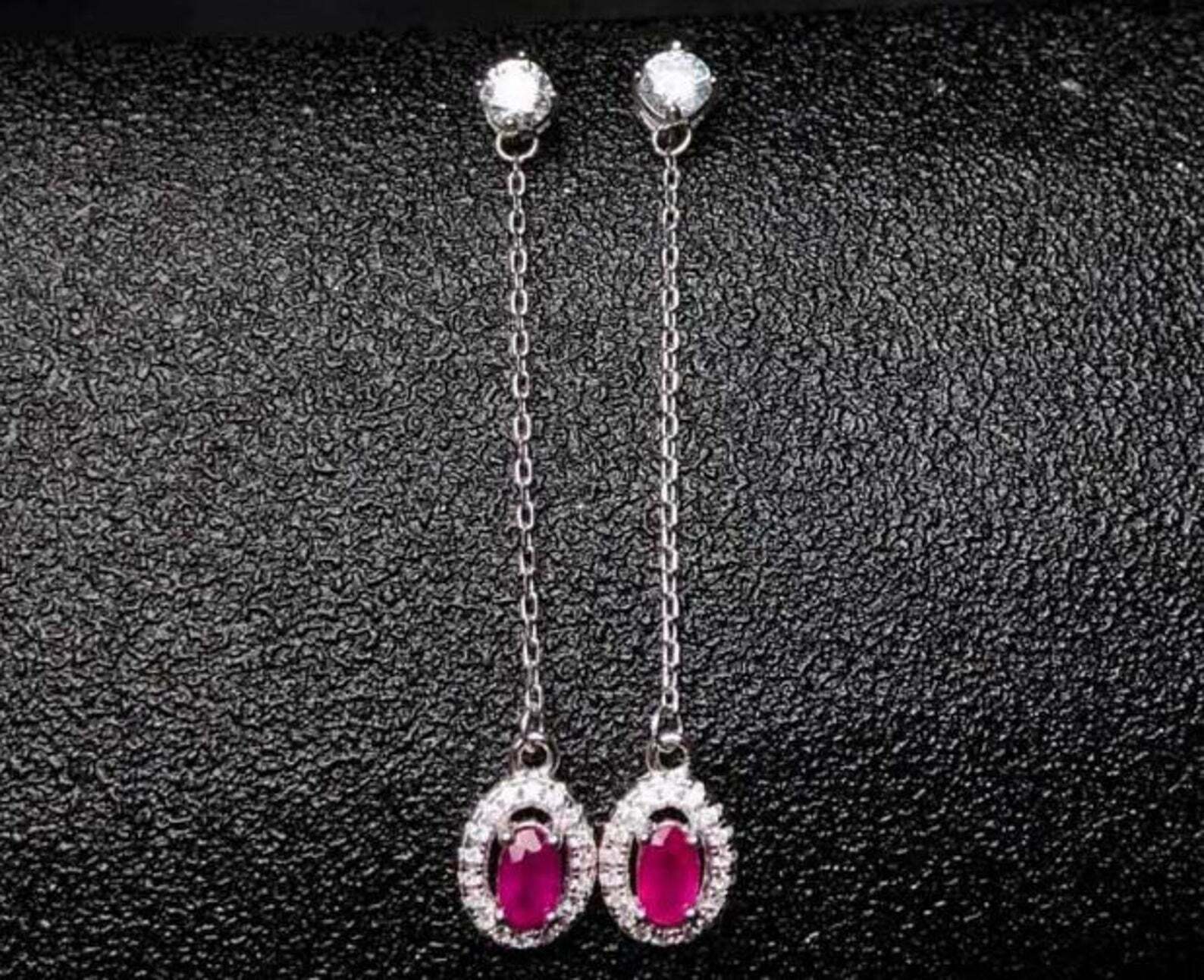 1.6ct Drop Earrings Oval Cut Pink Ruby Dangling Halo 14k White Gold Finish