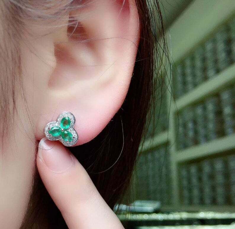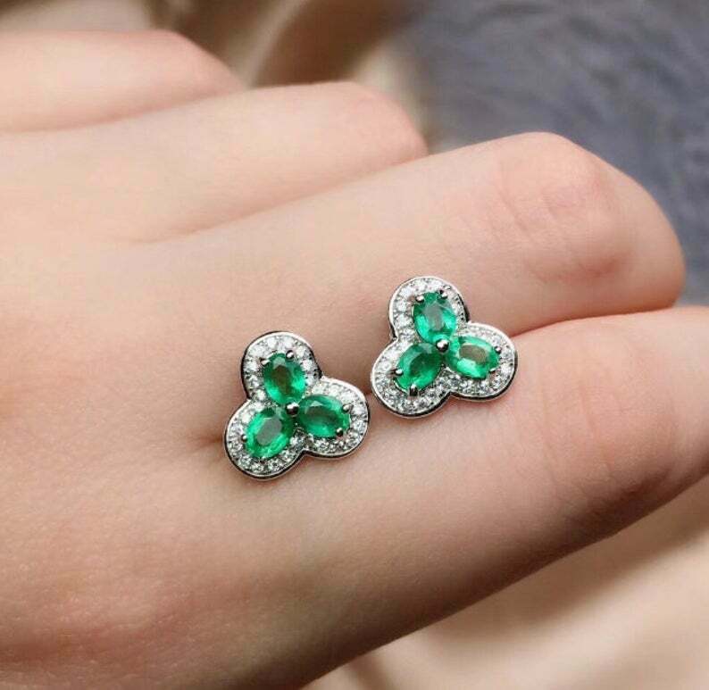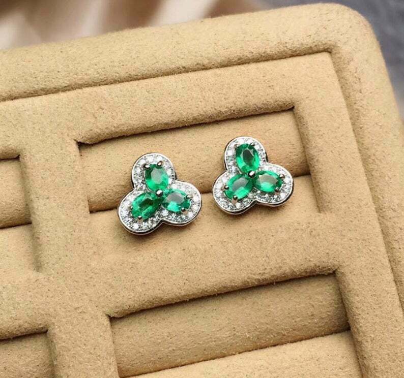 1.6ct Stud Earrings Oval Cut Green Emerald Leaf Halo Design 14k White Gold Finish