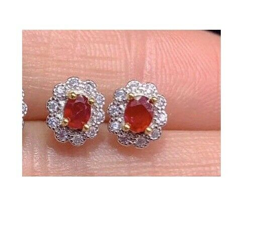 1.6ct Stud Earrings Oval Cut Red Garnet Diamond Floral 14k White Gold Finish
