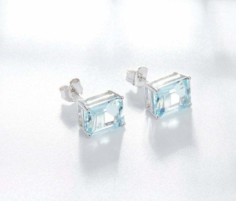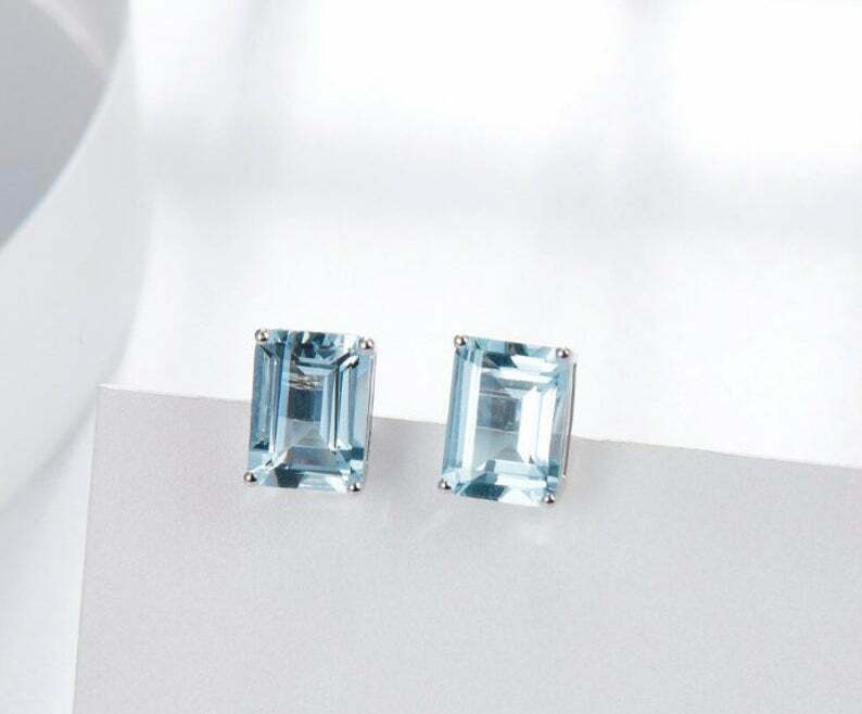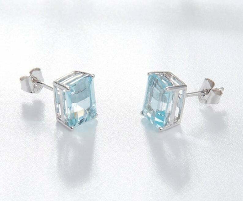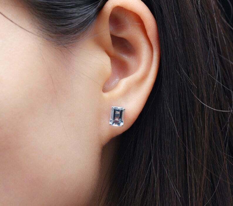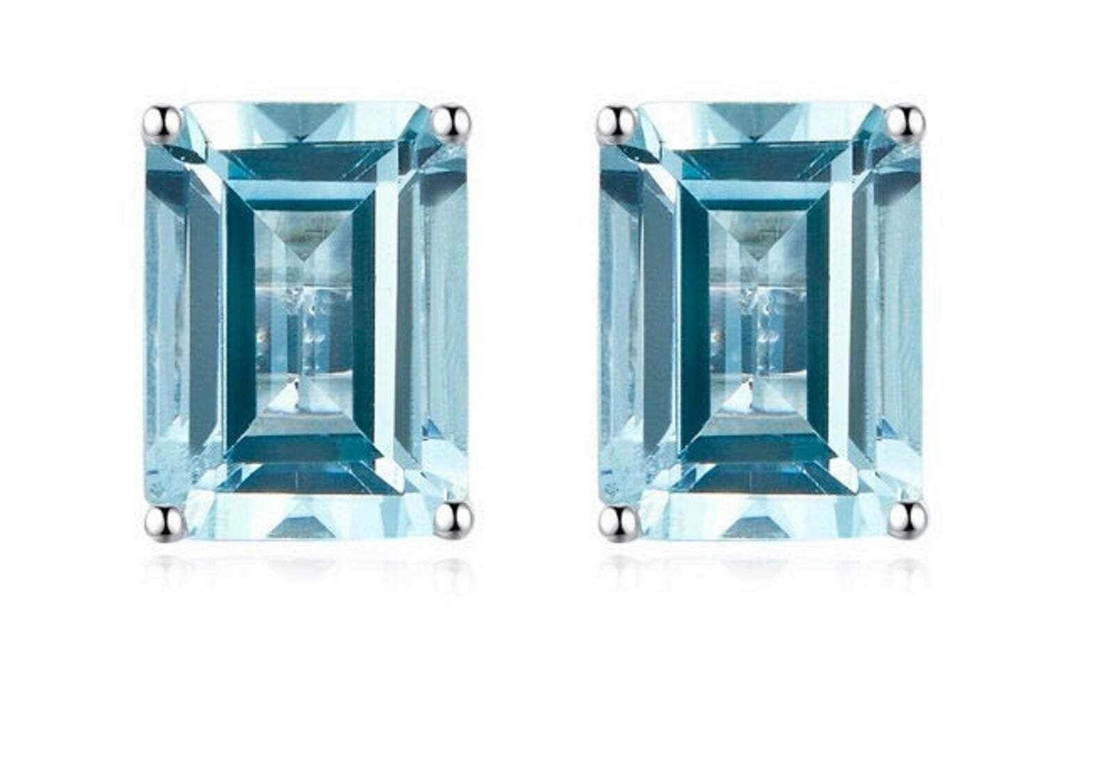 1.7ct Stud Earrings Emerald Cut Blue Aquamarine Solitaire 14k White Gold Finish