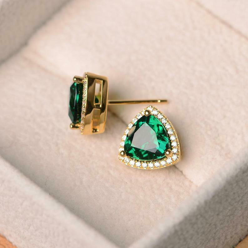 1.7ct Stud Earrings Trillion Cut Green Emerald Diamond Halo 14k Yellow Gold Over