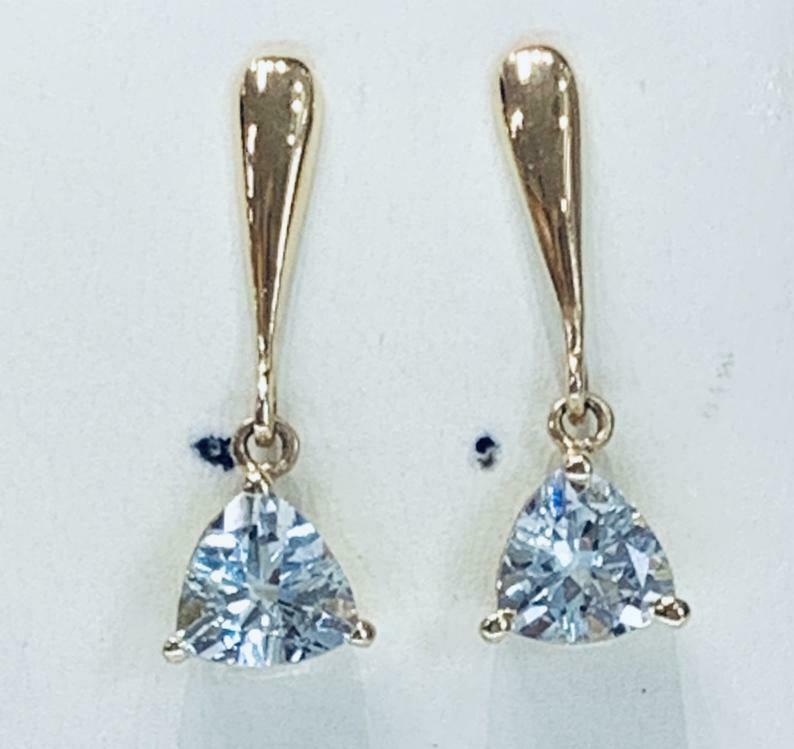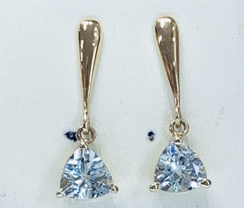 1ct Drop Earrings Trillion Cut Blue Aquamarine Vertical Bar 14k White Gold Finish