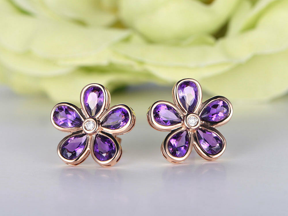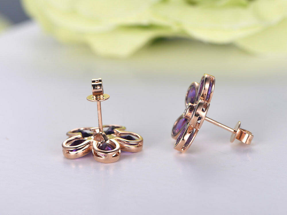 1ct PearCut Purple Amethyst Royal Floral Stud Earring Women 14k Rose Gold Finish