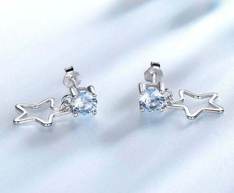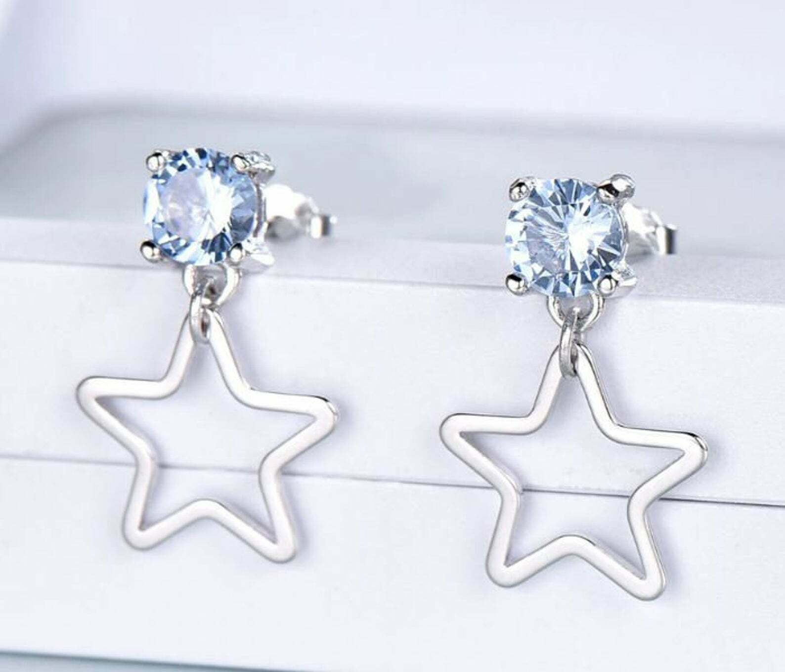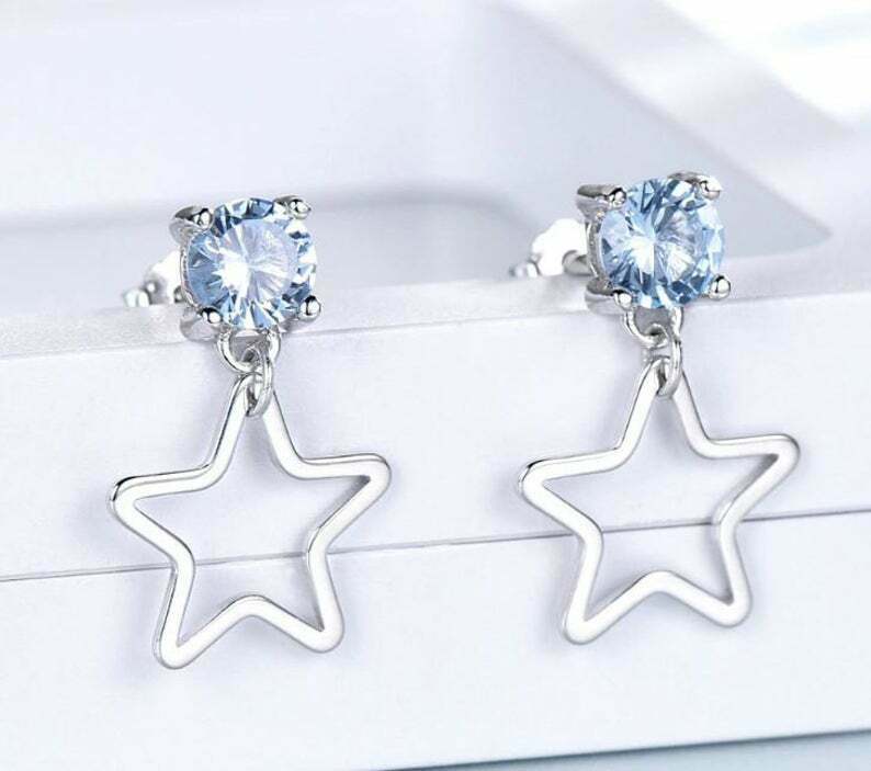 1ct Round Cut Blue Topaz Star Design Dangle Drop Earrings 14k White Gold Finish