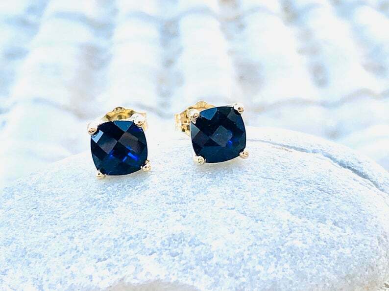 1ct Stud Earrings Cushion Cut Blue Sapphire Solitaire Women 14k Yellow Gold Over