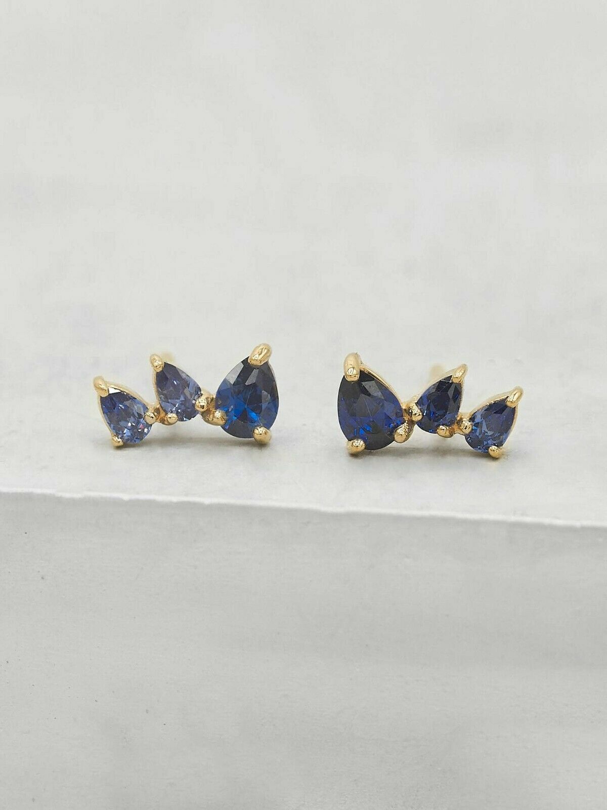 1ct Stud Earrings Pear Cut Blue Sapphire Trilogy Petite 14k Yellow Gold Finish