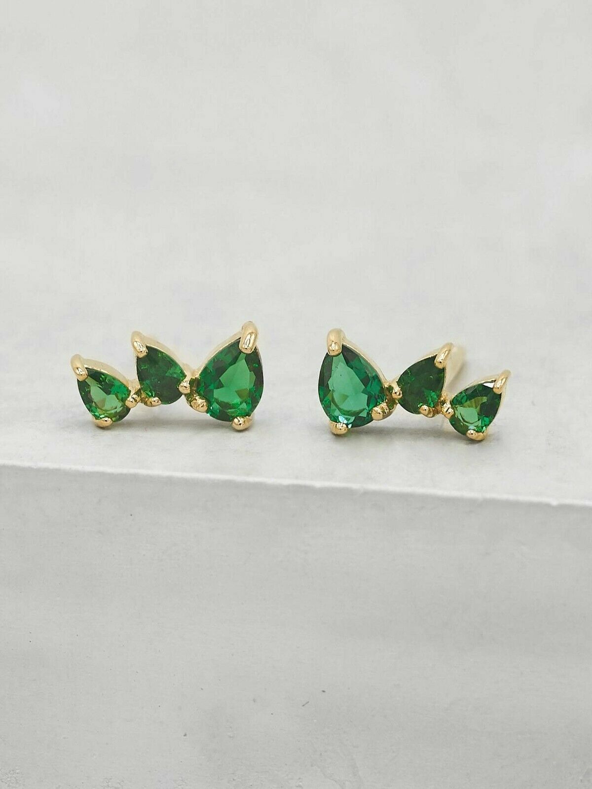 1ct Stud Earrings Pear Cut Green Emerald Trilogy Petite 14k Yellow Gold Finish