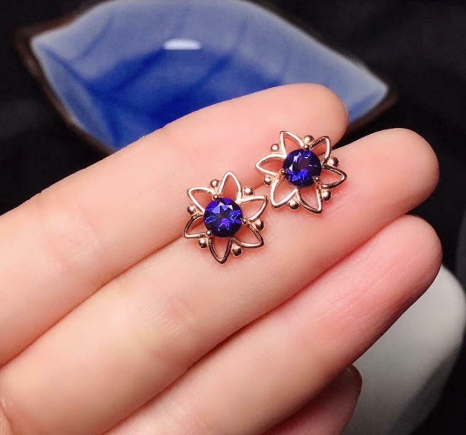 1ct Stud Earrings Round Cut Blue Sapphire Floral Star Design 14k Rose Gold Finish
