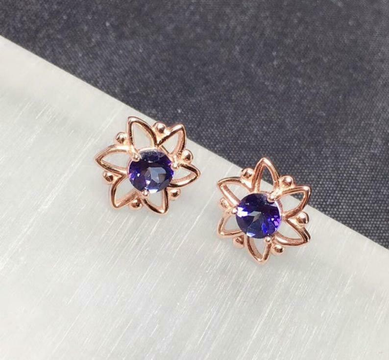 1ct Stud Earrings Round Cut Blue Sapphire Floral Star Design 14k RoseGold Finish