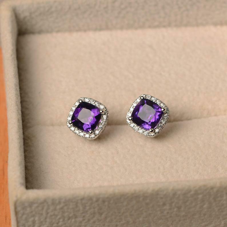 1ct Stud Earrings Round Cut Purple Amethyst Diamond Halo 14k White Gold Finish