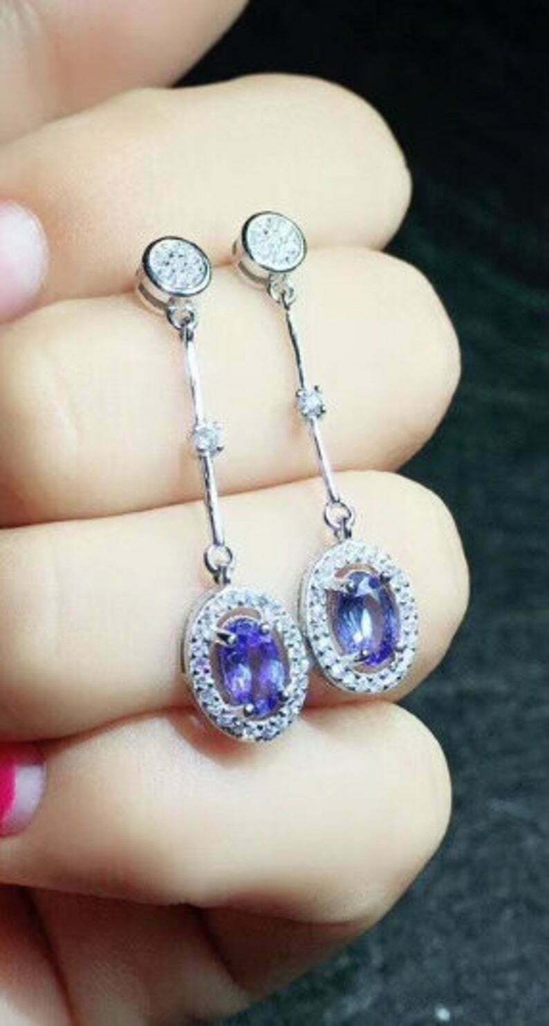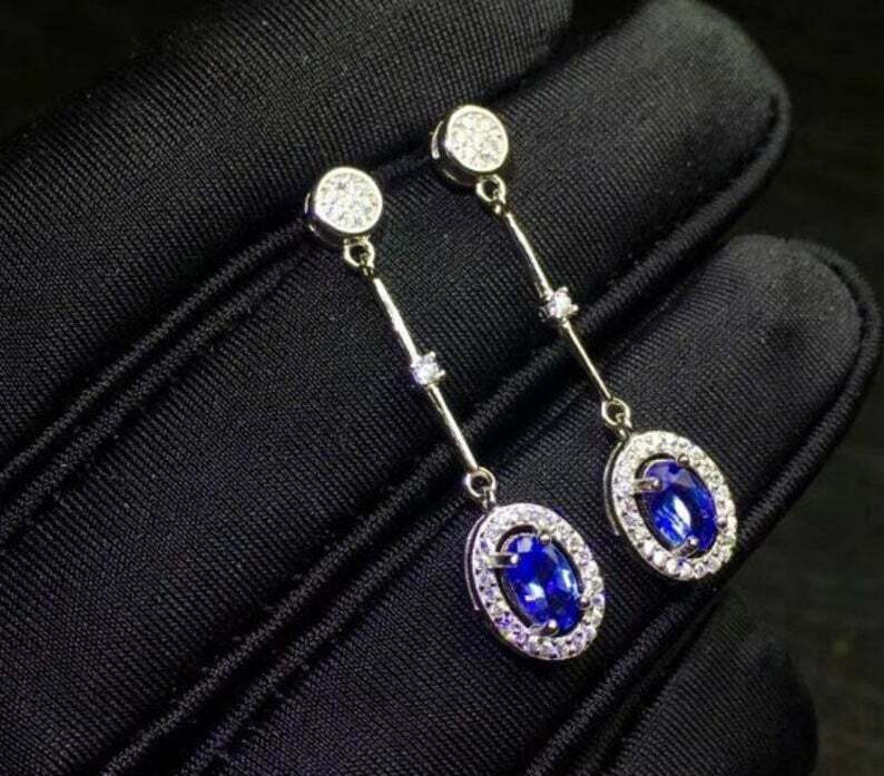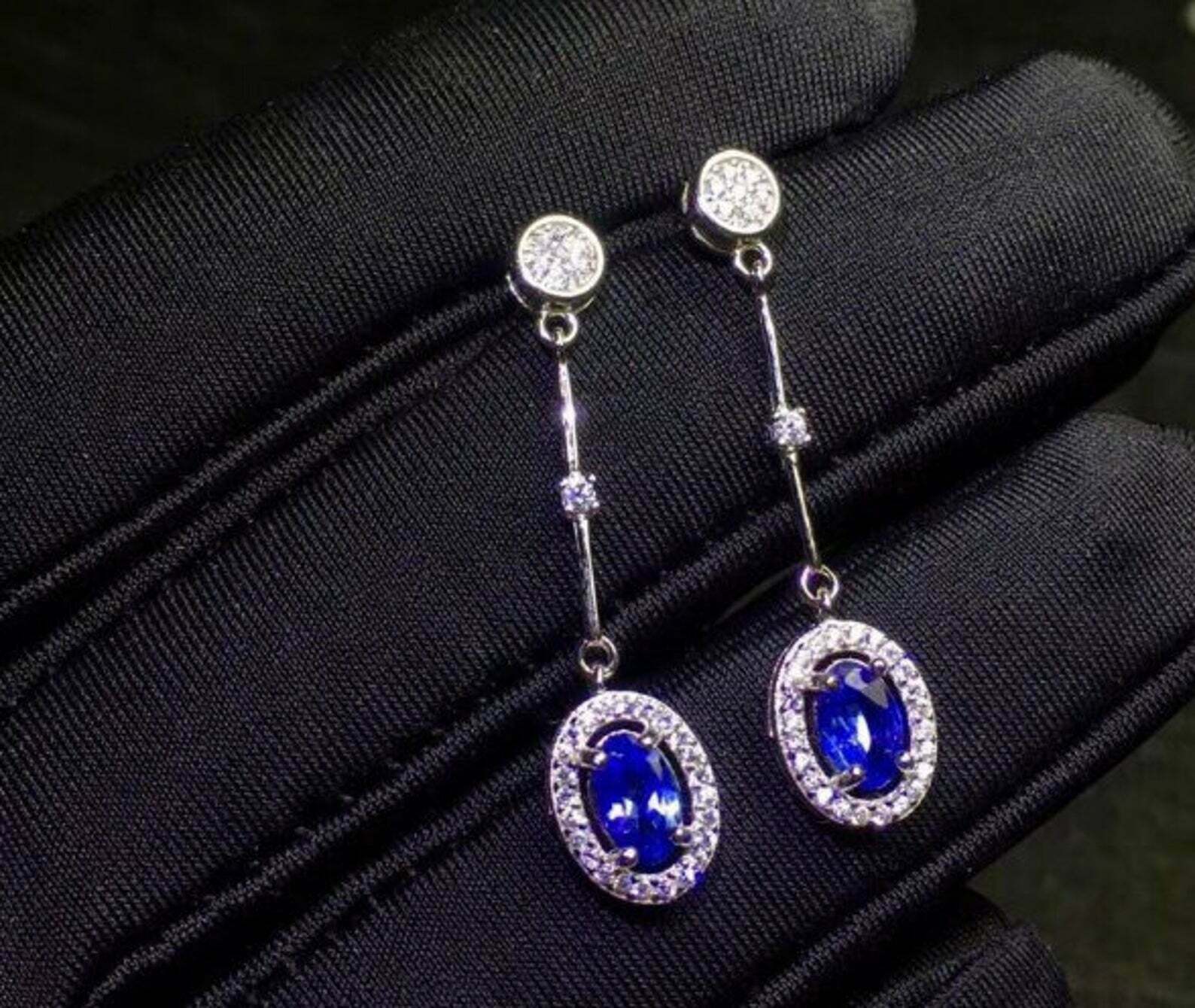 2.1ct Drop Earrings Oval Cut Blue Tanzanite Dangling Halo 14k White Gold Finish