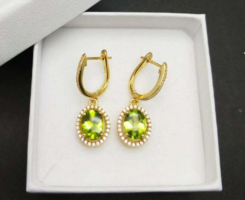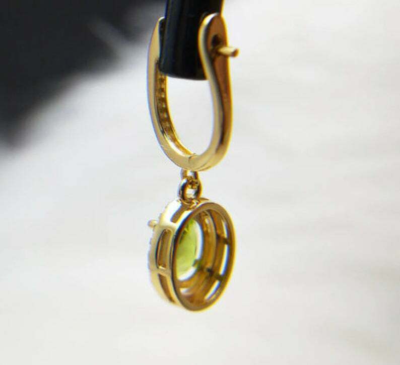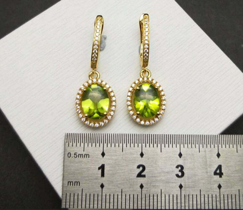 2.1ct Drop Earrings Oval Cut Green Peridot Diamond Halo 14k Yellow Gold Finish