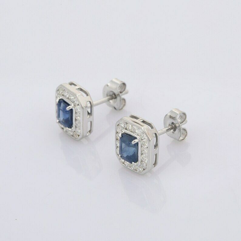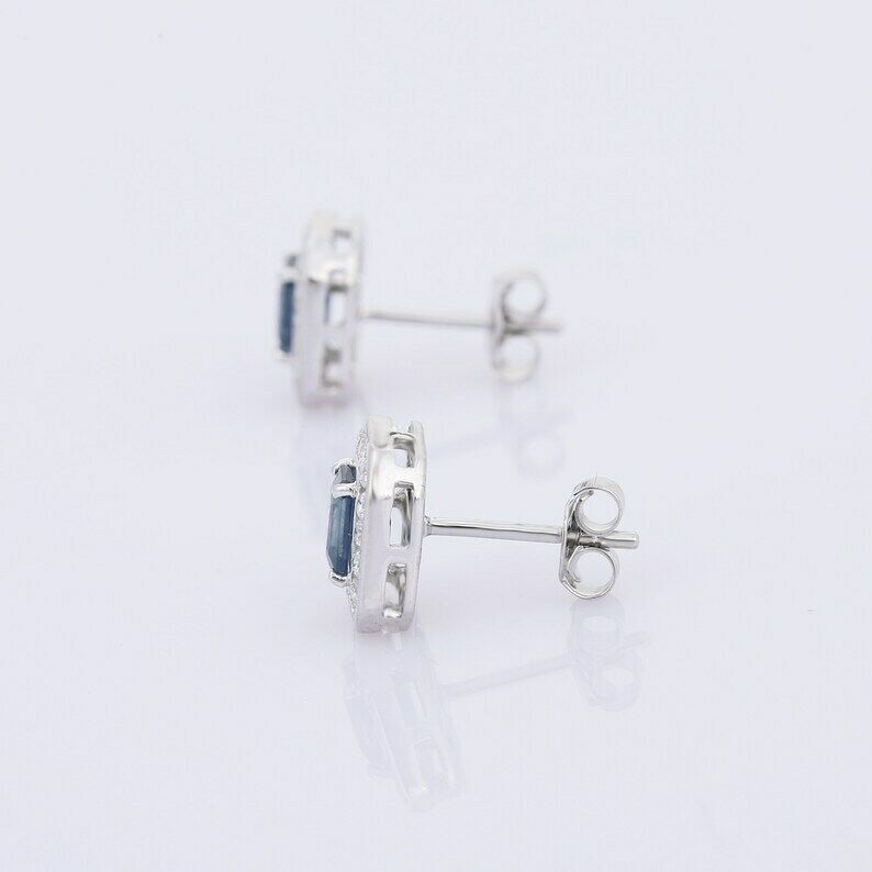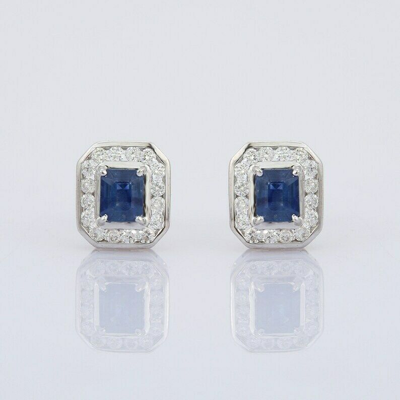 2.1ct Stud Earrings Emerald Cut Blue Sapphire Diamond Halo 14k White Gold Finish