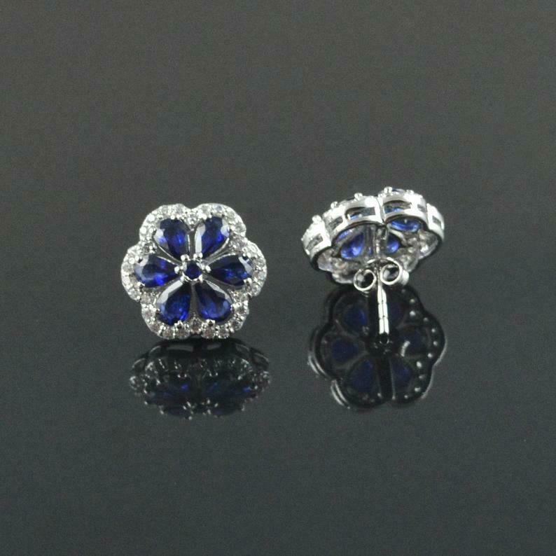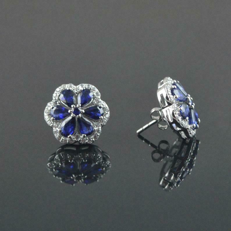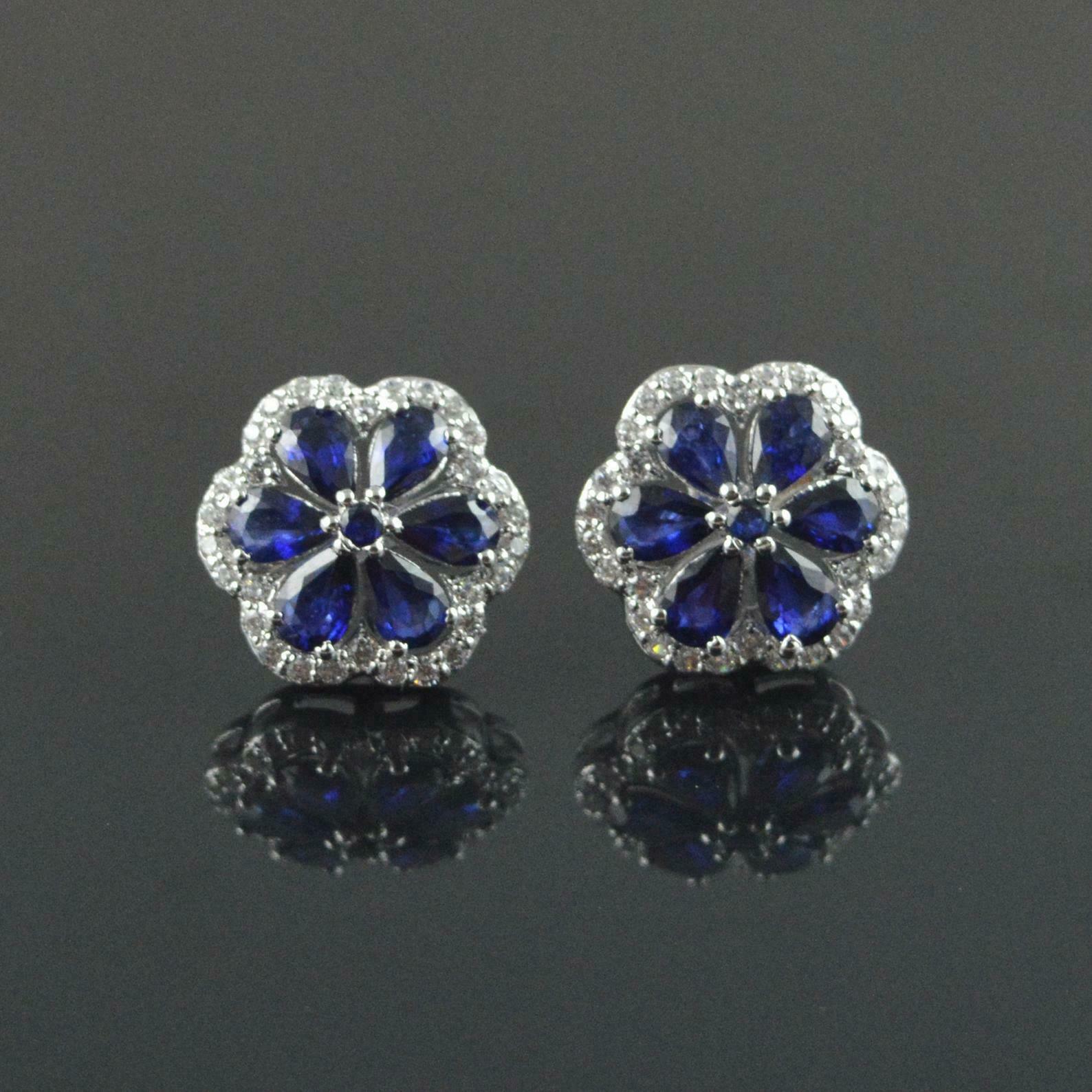 2.1ct Stud Earrings Pear Cut Blue Sapphire Diamond Floral 14k White Gold Finish