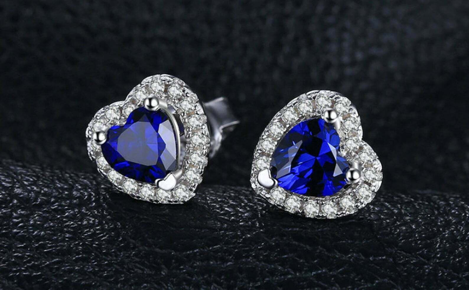 2.2ct Stud Earrings Heart Cut Blue Sapphire Diamond Halo 14k White Gold Finish