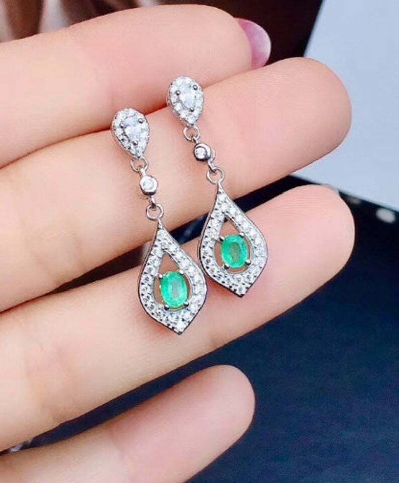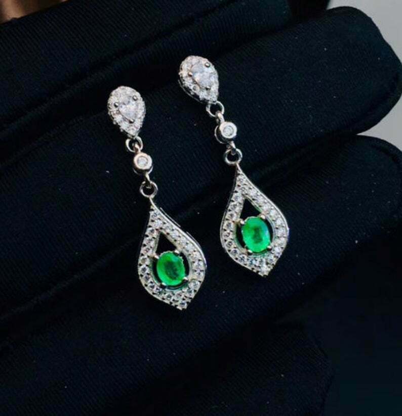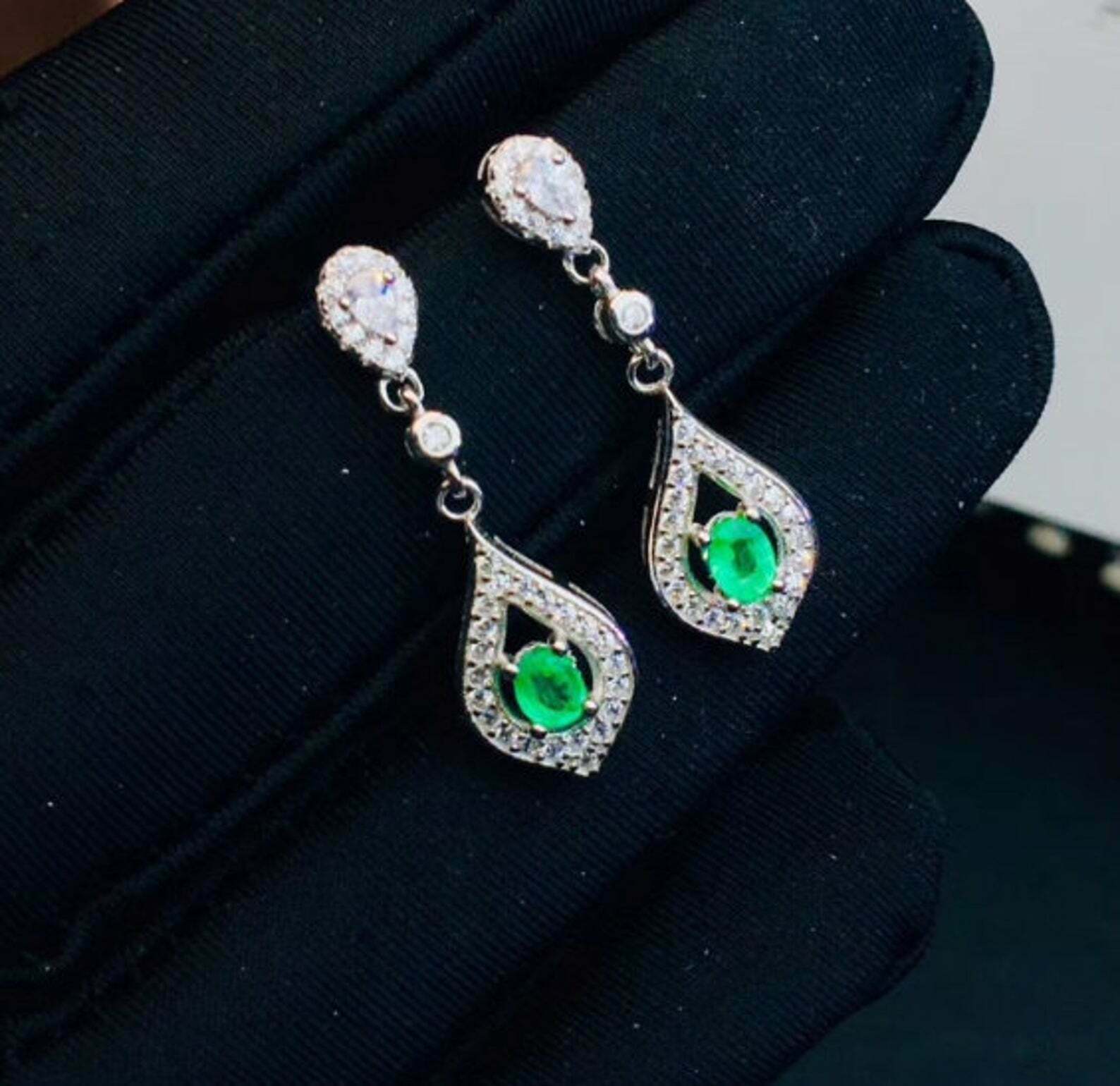 2.3ct Drop Earrings Oval Cut Green Emerald Dangling Halo 14k White Gold Finish