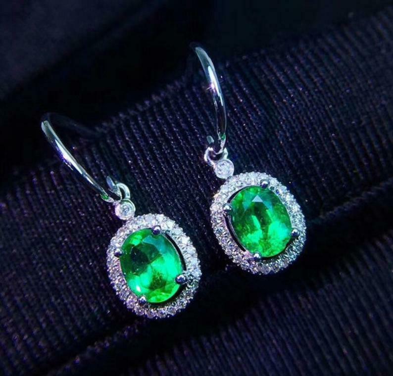 2.3ct Drop Earrings Oval Cut Green Emerald Diamond Halo 14k Yellow Gold Finish