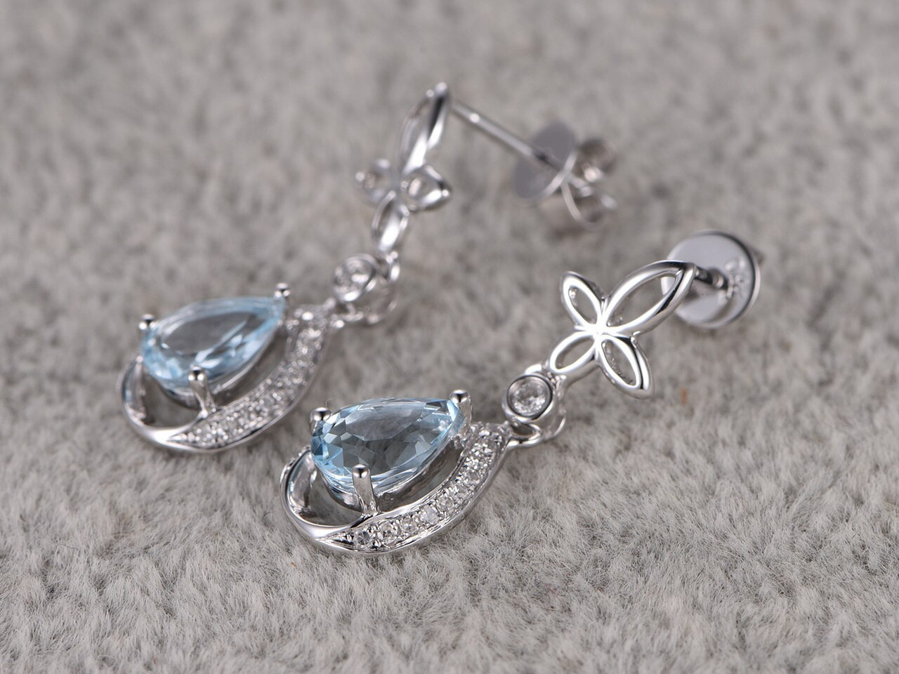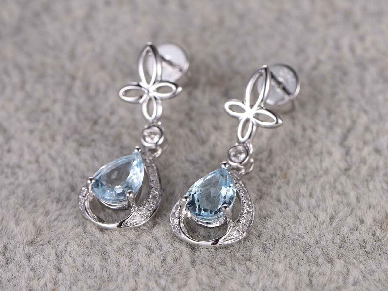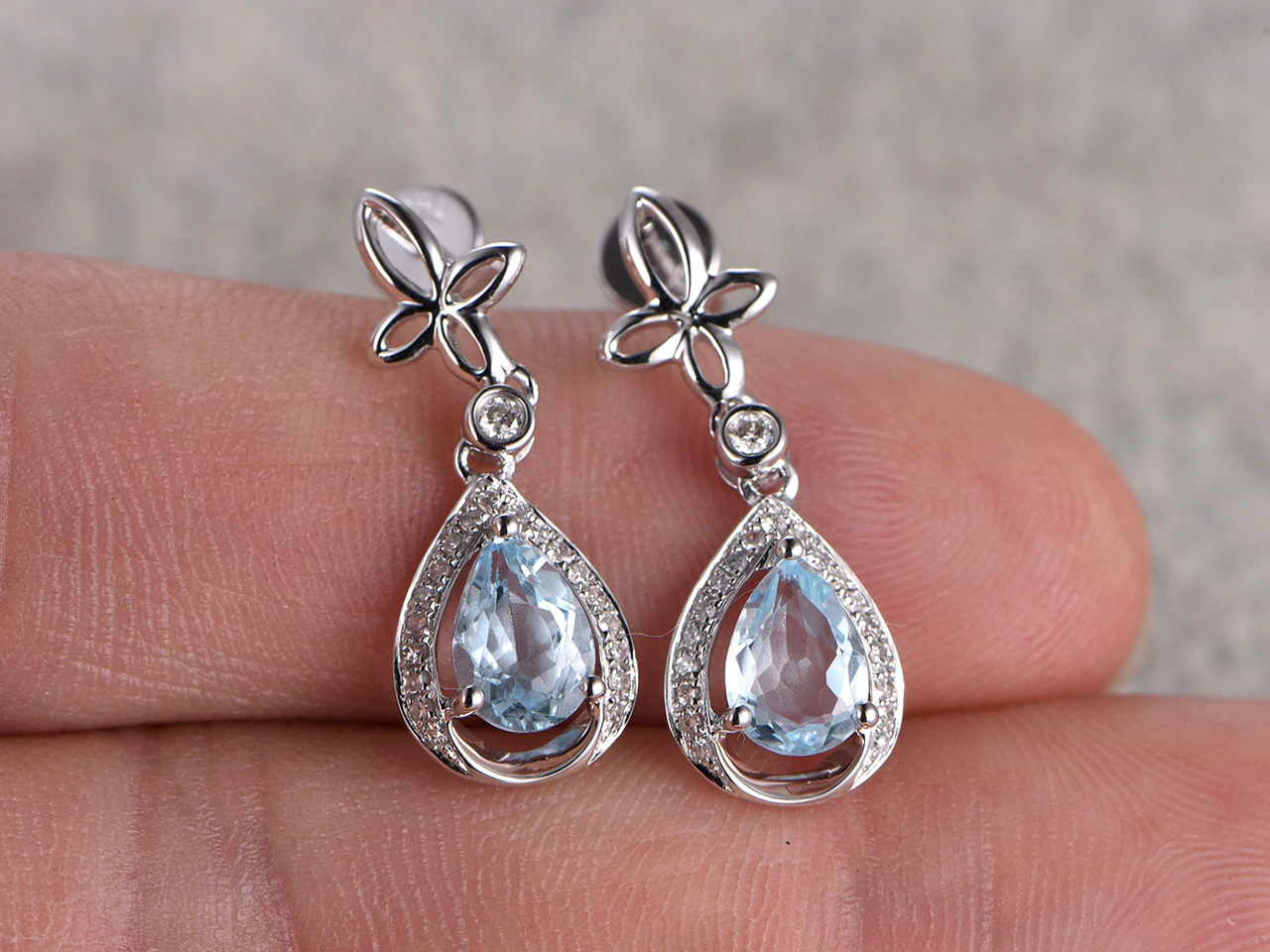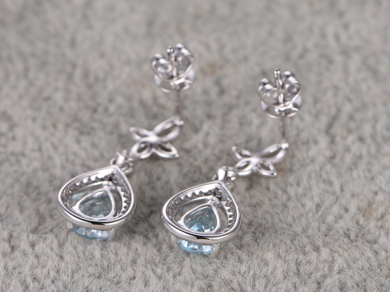 2.3ct Drop Earrings Pear Cut Aquamarine Halo Floral Dangle 14k White Gold Finish
