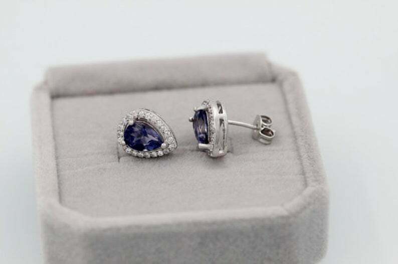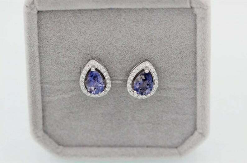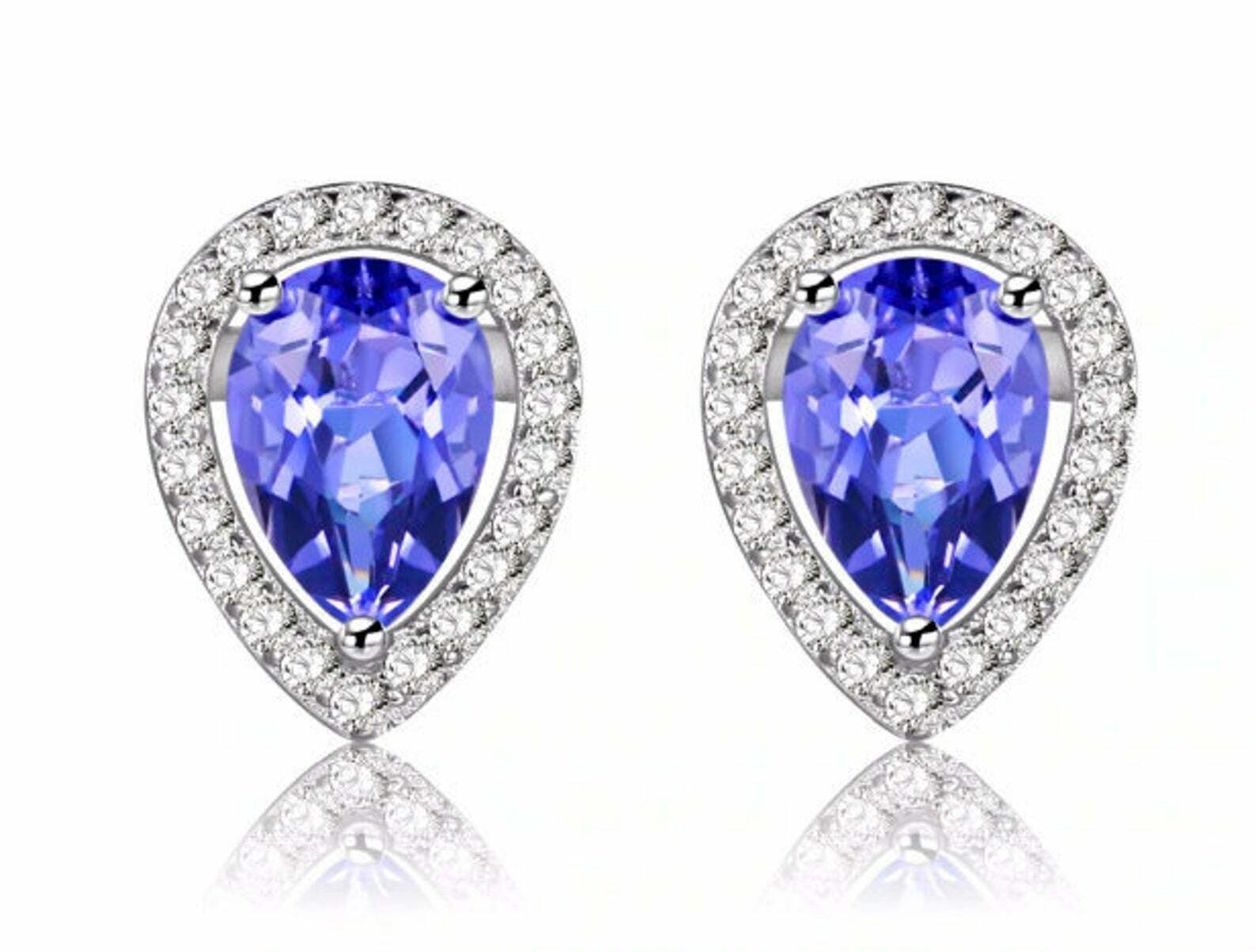 2.3ct Stud Earrings Pear Cut Blue Tanzanite Diamond Halo 14k White Gold Finish