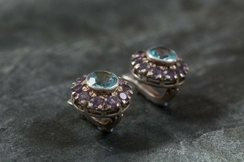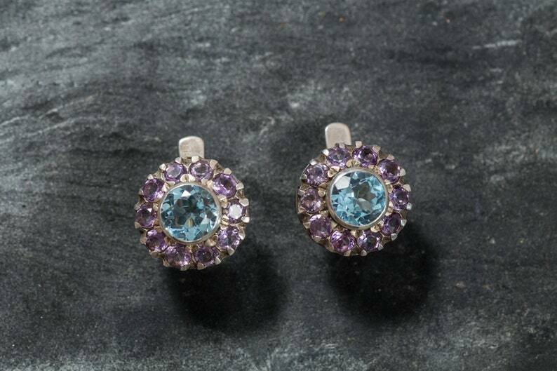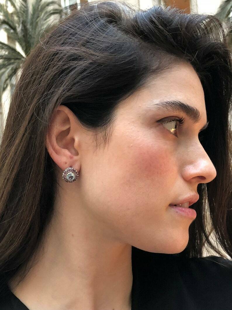 2.3ct Stud Earrings Round Cut Blue Aquamarine Halo Cluster 14k White Gold Finish