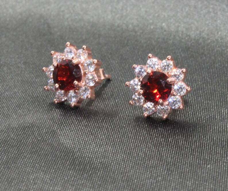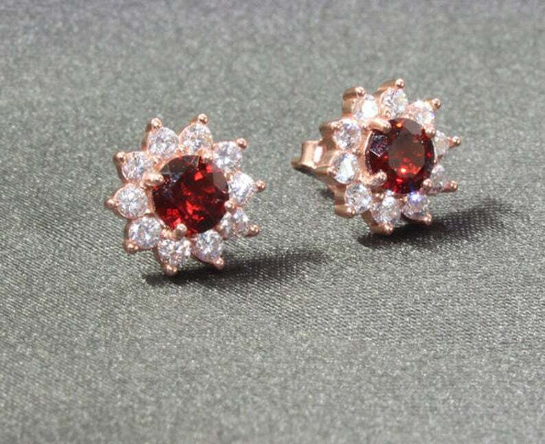 2.3ct Stud Earrings Round Cut Red Garnet Floral Halo 14k Rose Gold Finish