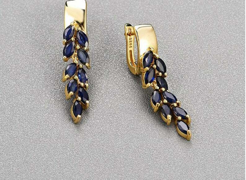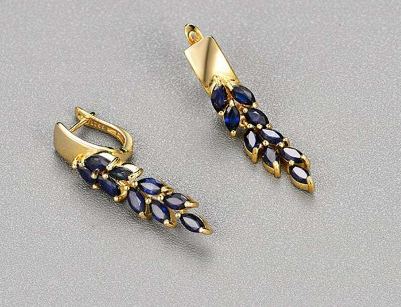 2.5ct Drop Earrings Marquise Cut Blue Sapphire Leaf Design 14k Yellow Gold Finish