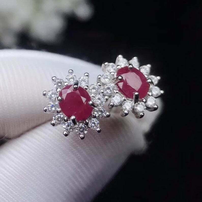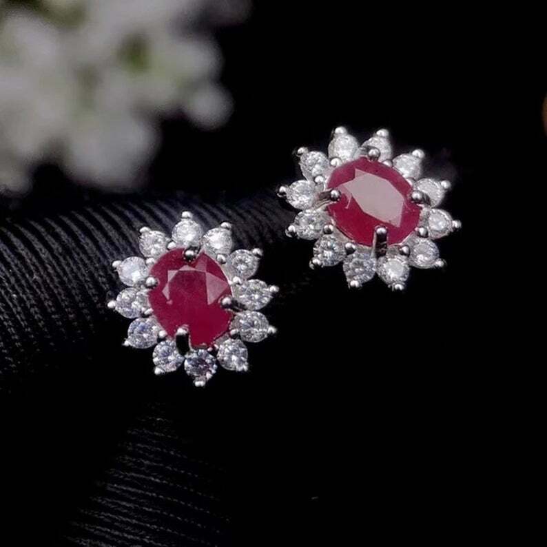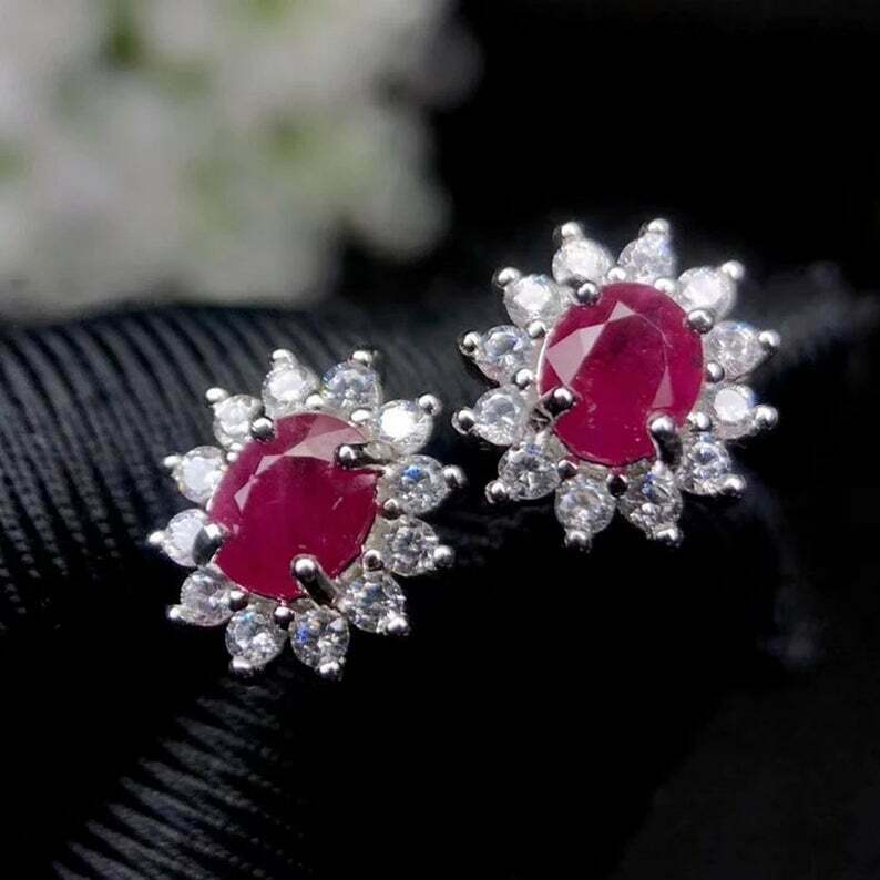 2.5ct Oval Cut Pink Ruby Halo Floral Design Stud Earrings 14k White Gold Finish