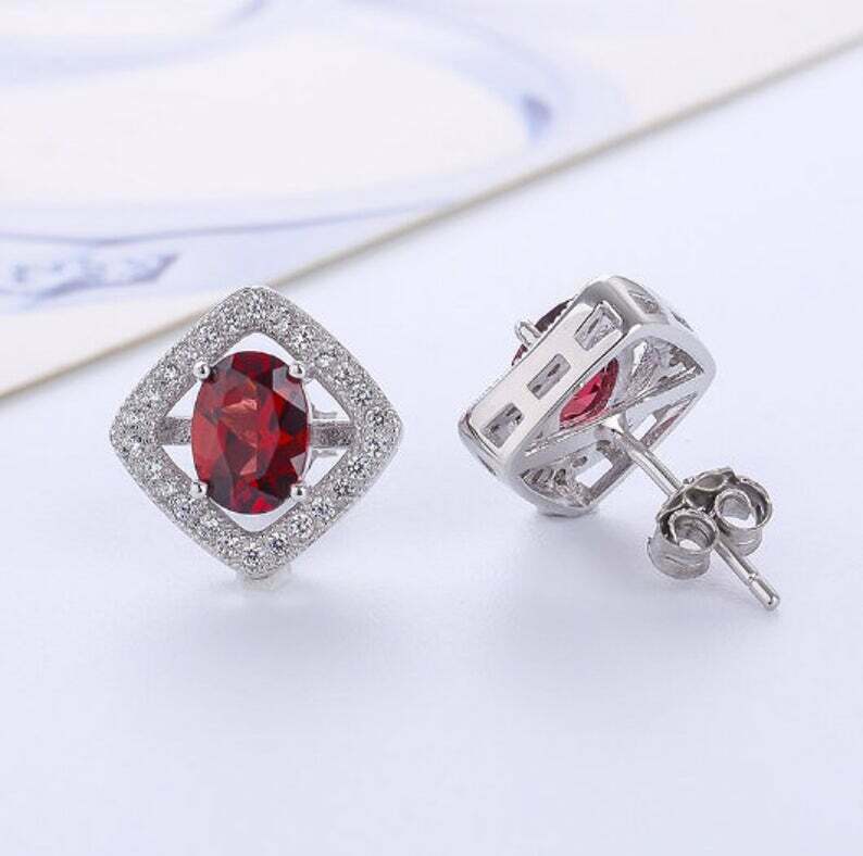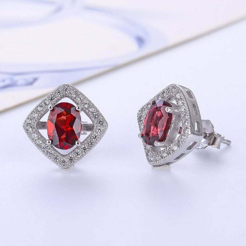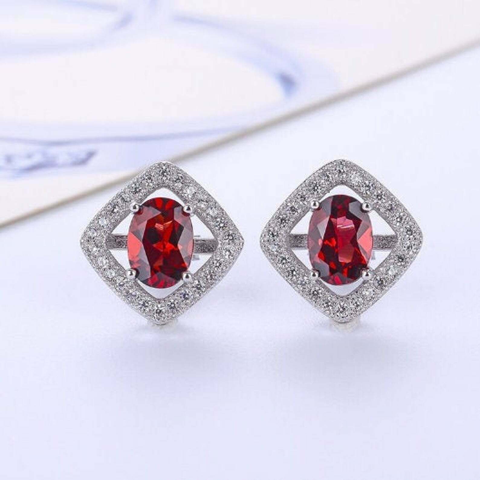 2.5ct Stud Earrings Oval Cut Red Garnet Diamond Open Halo 14k White Gold Finish