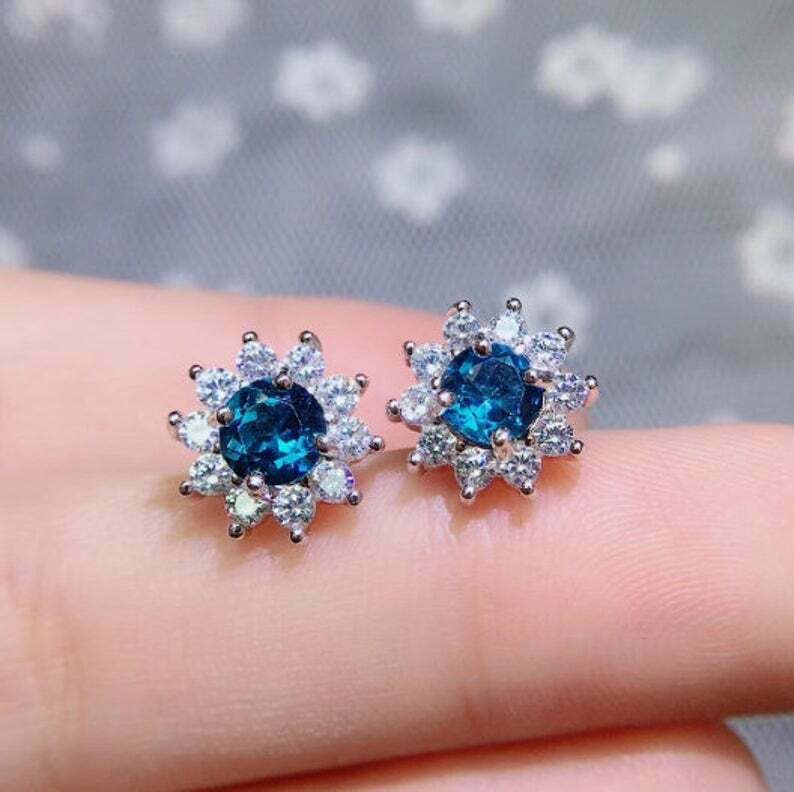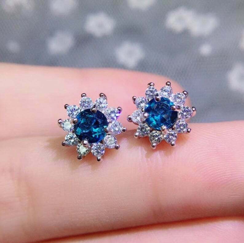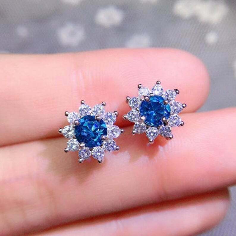 2.5ct Stud Earrings Round Cut Blue Sapphire Diamond Floral 14k White Gold Finish