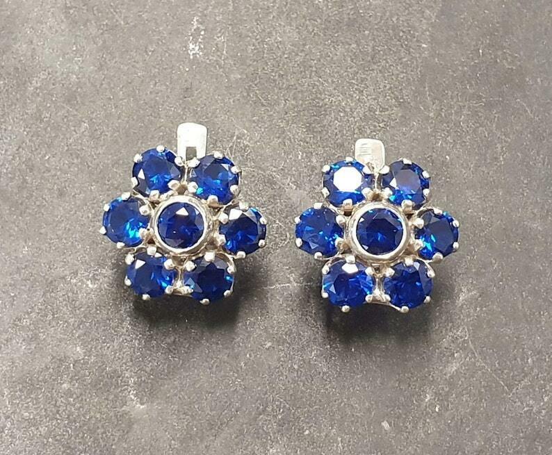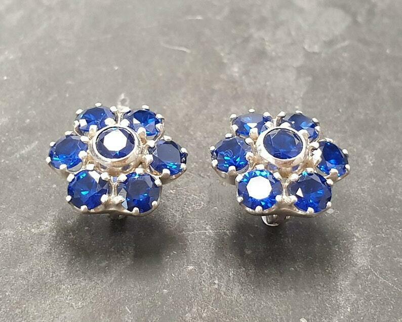 2.5ct Stud Earrings Round Cut Blue Sapphire Floral Cluster 14k White Gold Finish