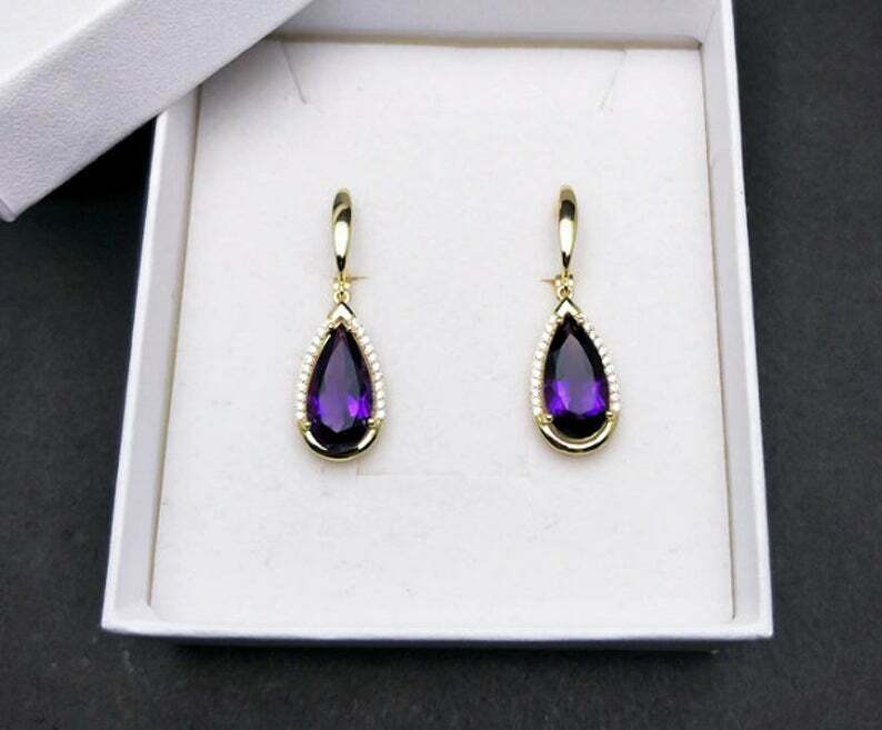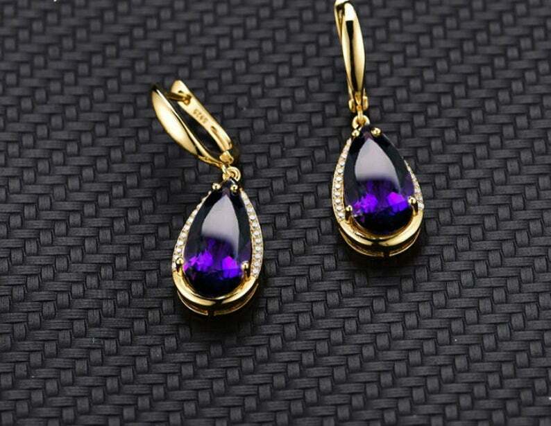 2.7ct Drop Earrings Pear Cut Purple Amethyst Water Tear Drop 14k Yellow Gold Finish