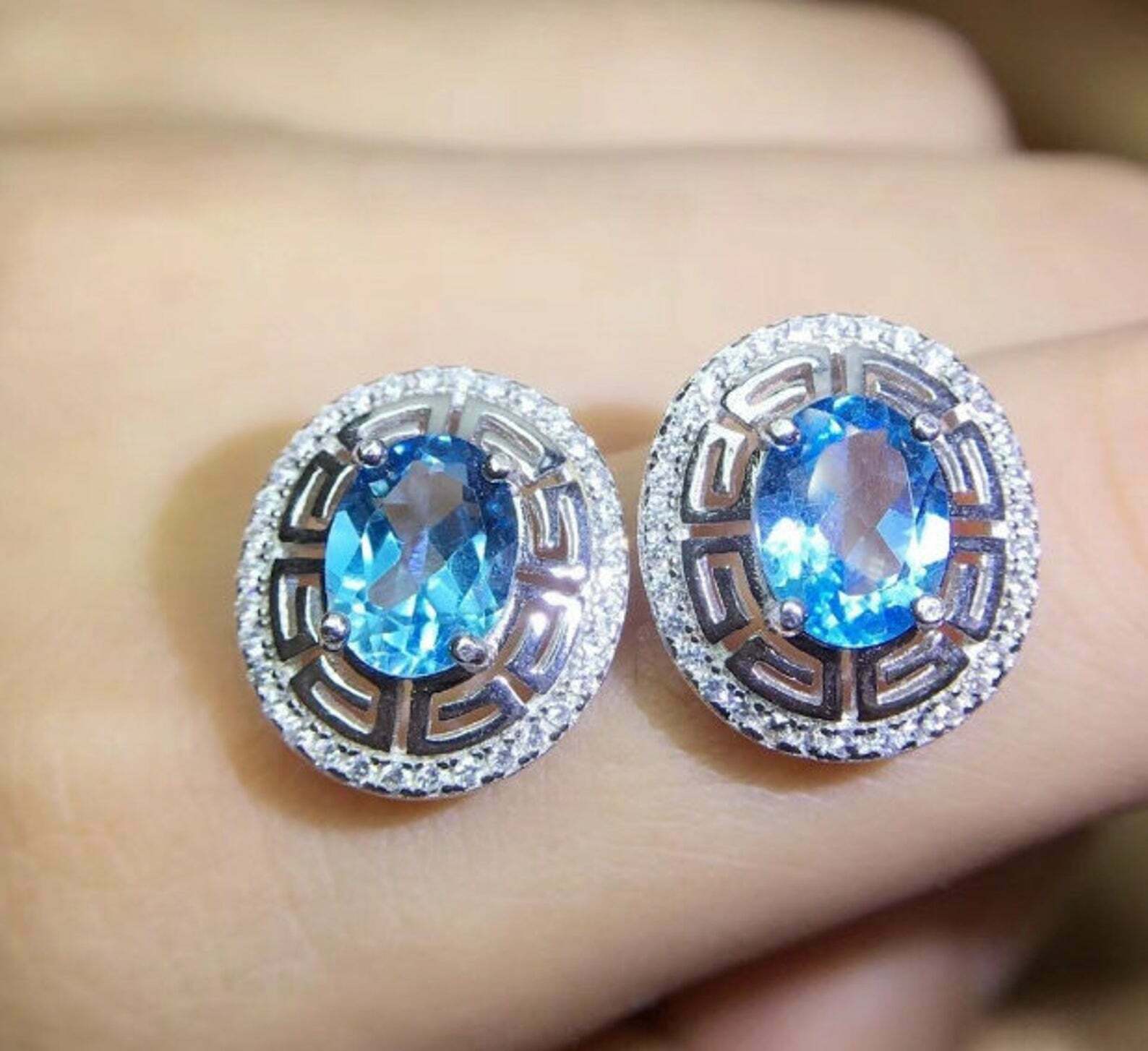 2.7ct Stud Earrings Oval Cut Blue Topaz Stylish Halo 14k White Gold Finish