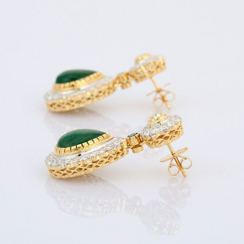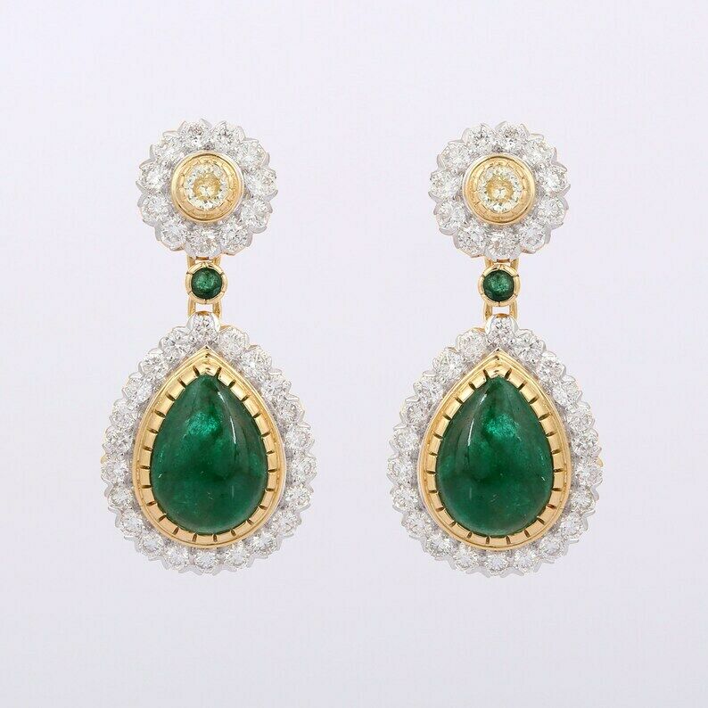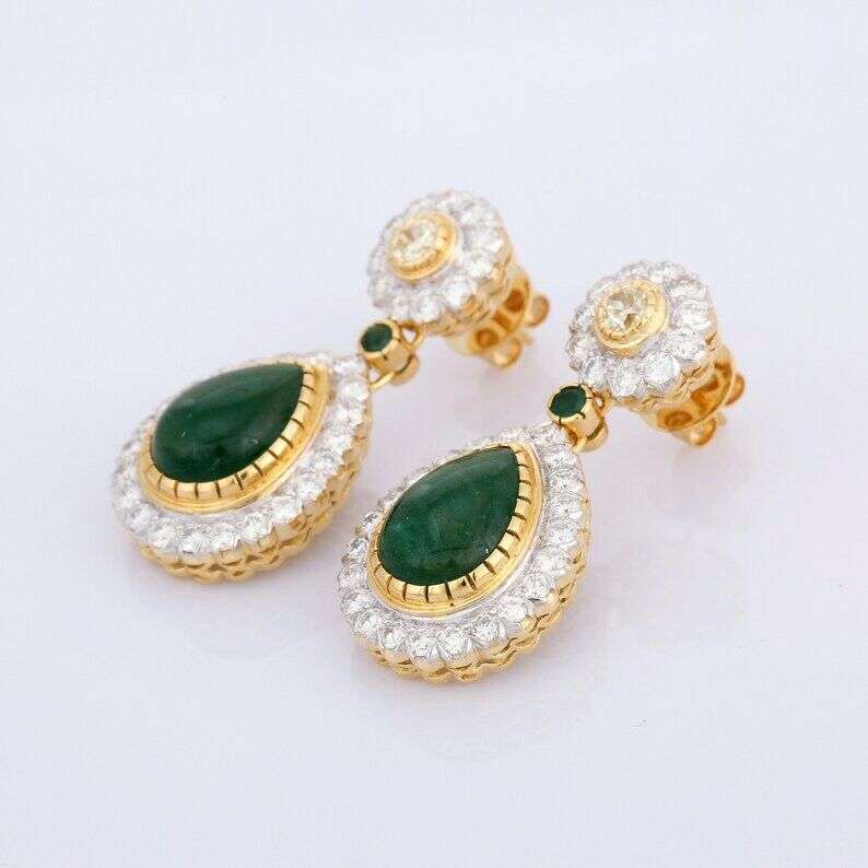 2.9ct Drop Earrings Pear Cut Green Emerald Tear Drop Halo 14k Yellow Gold Finish