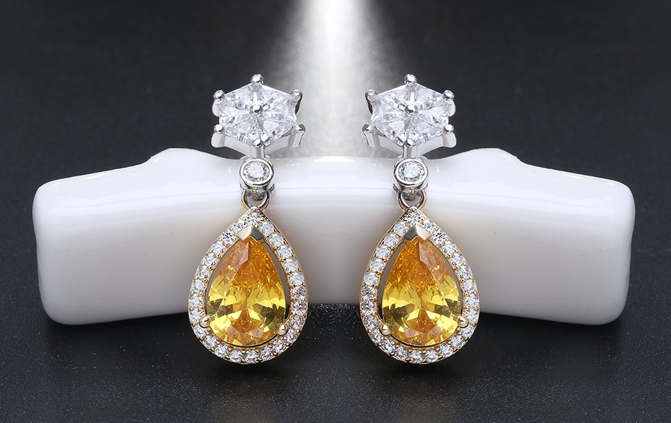 2.9ct Pear Cut Yellow Citrine Halo Teardrop Stud Earrings 14k Dual Tone Finish